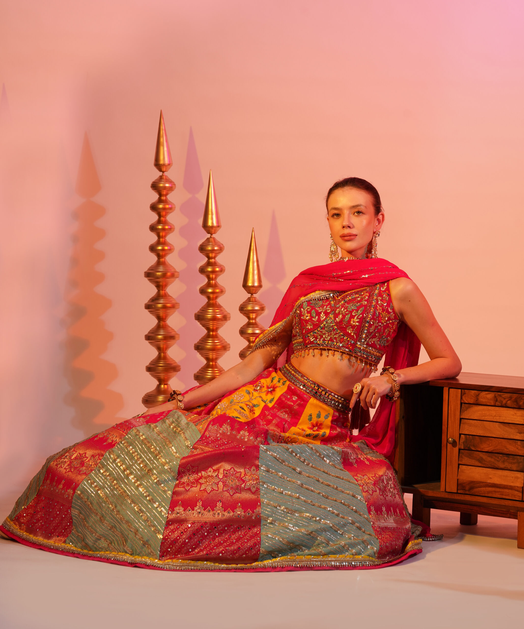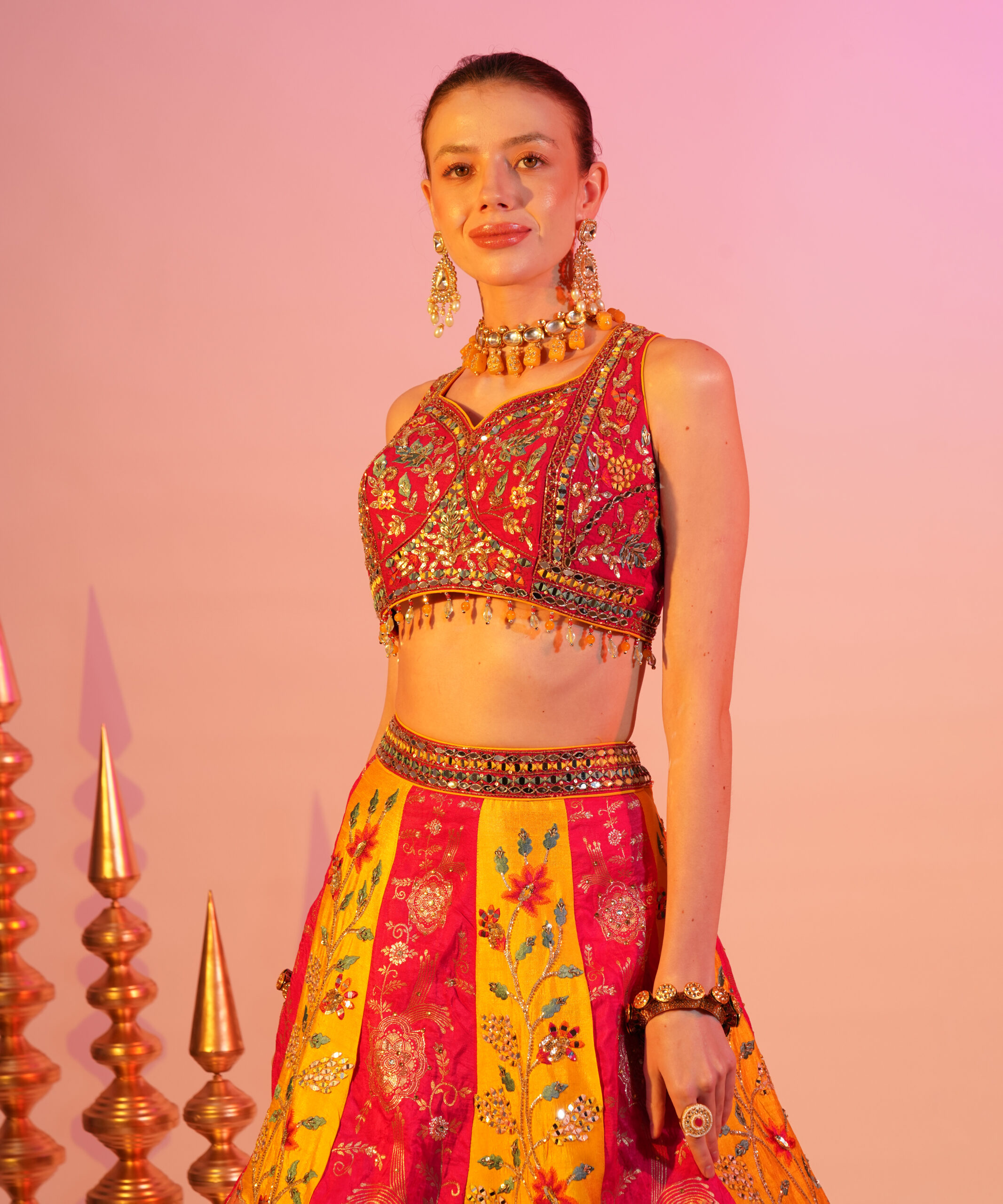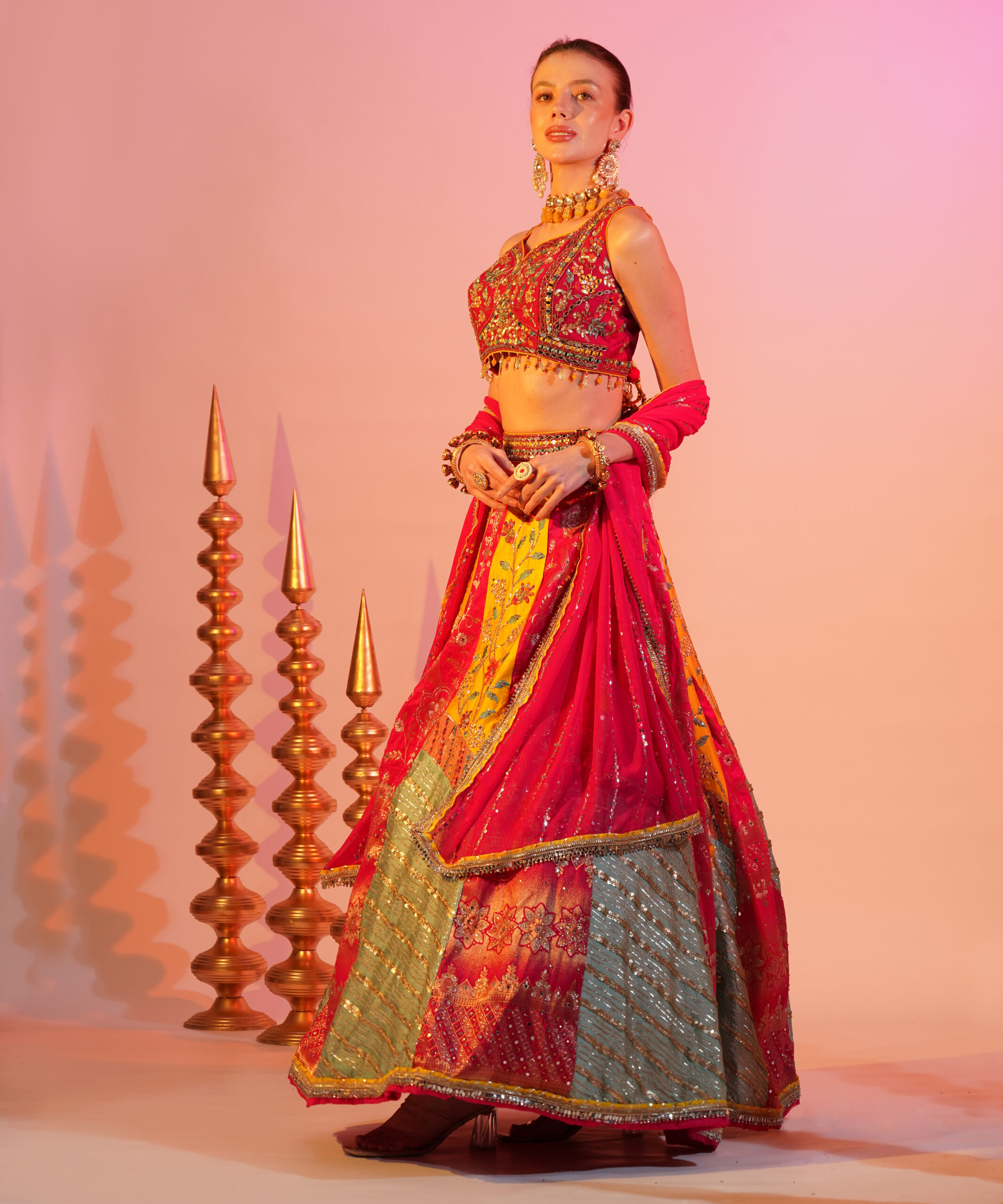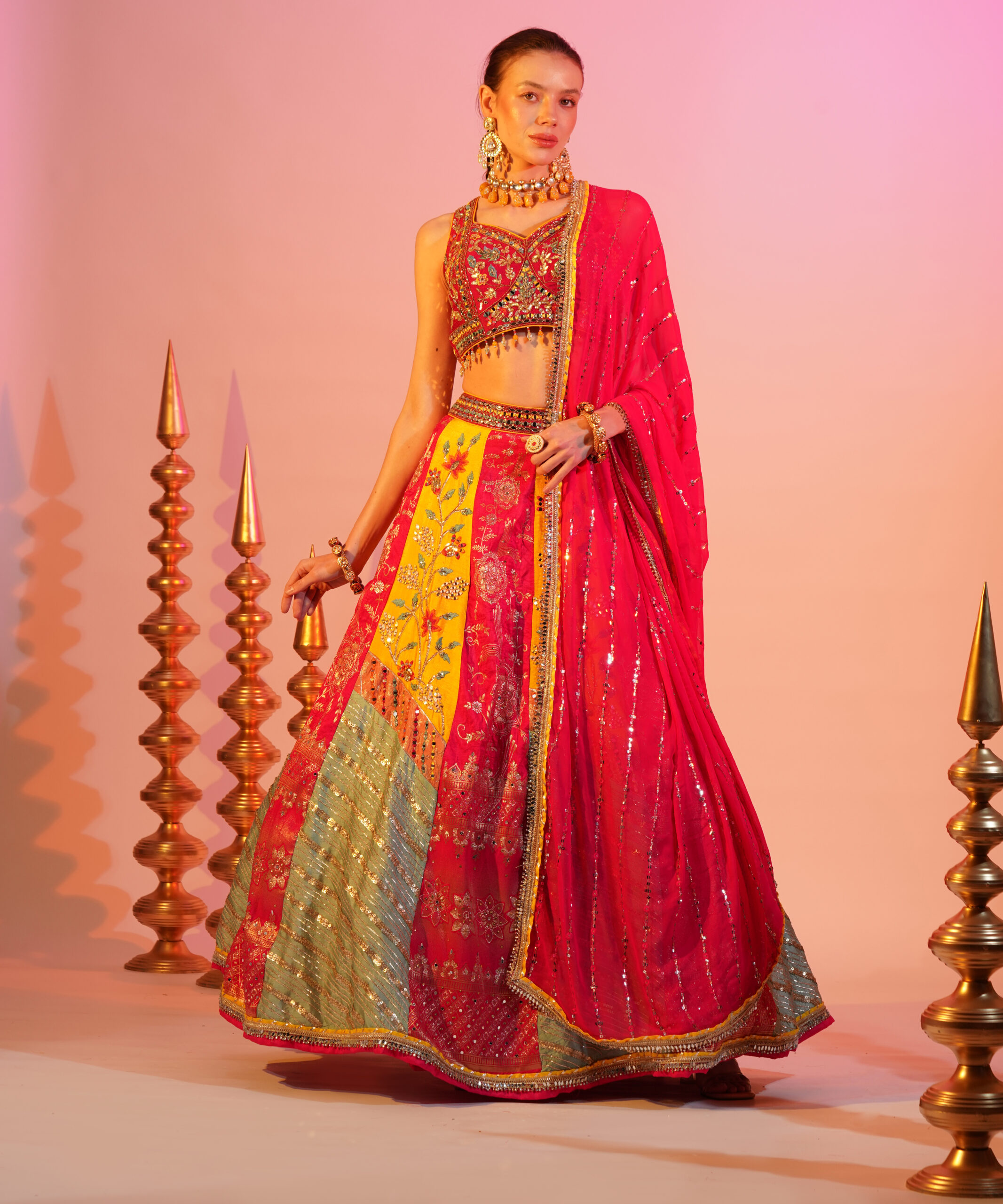 This vibrant ensemble features a colorful lehenga paired with an intricately embroidered blouse. The set is complemented by a mustard yellow Banarasi dupatta, adding a touch of elegance. Perfect for festive occasions, this outfit radiates joy and sophistication.
